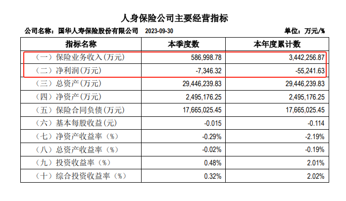 三季度偿付能力报告显示,截至2023年三季度末,国华人寿保险业务年度累计收入344.26亿元,同比增长20.26%;净利润年度累计亏损5.52亿元,亏损进一步扩大。