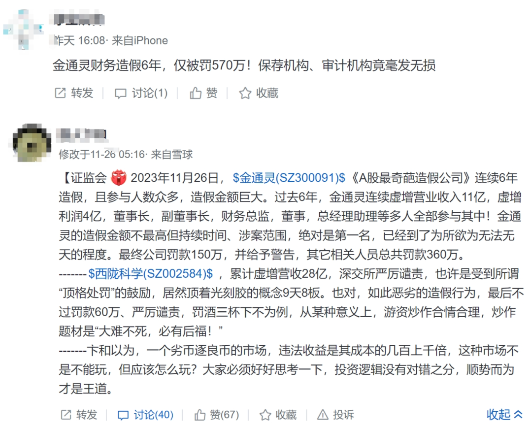 “金通灵财务造假6年,仅被罚500多万。”