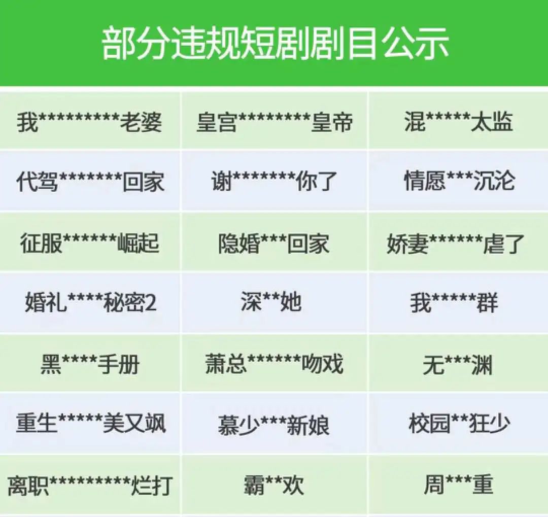 通过近期被下架的短剧名字《娇妻XXXXXX虐了》《萧总XXXXXX吻戏》等,大家也可以自行脑补一下。
