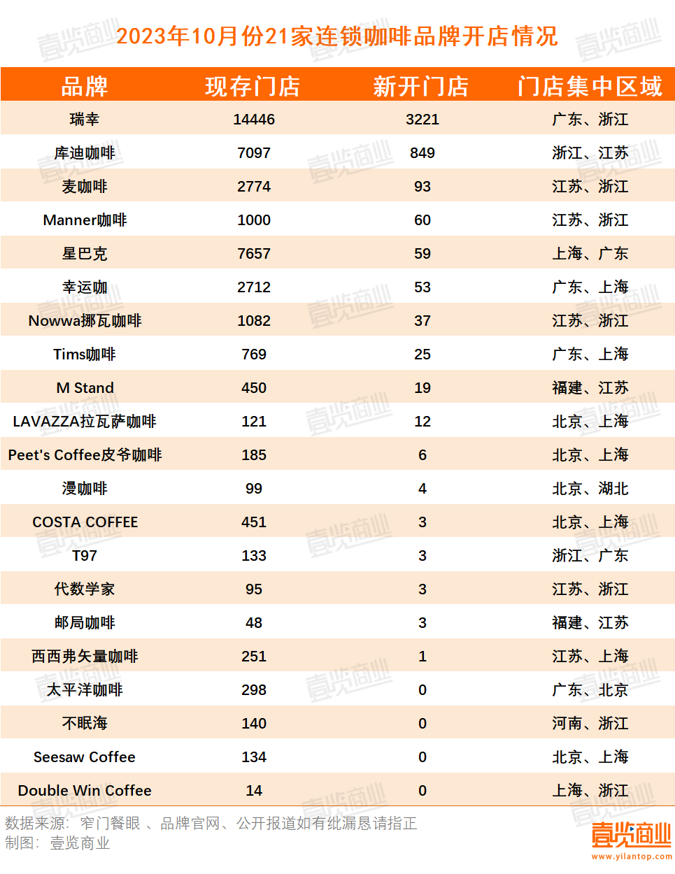 10月,连锁咖啡们加速了扩张步伐。据壹览商业不完全统计10月21家连锁咖啡品牌新开店为4451家,与上月相比增加3473家,门店总数达39956家,接近4万家。
