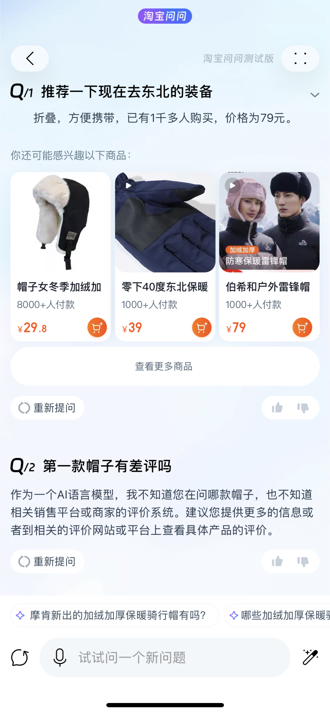 从整体的使用体验来看,淘宝问问依然存在现阶段AI应用常见的问题。比如,在推荐完商品后,无法继续回答「第一个帽子怎么样」的问题,或者无法将「第一个评价怎么样」这种口语化的问题与上一个回答进行关联。从答案内容上看,对于如何露营、去东北应该准备些什么的回答,还都比较笼统,不够全面和个性化。