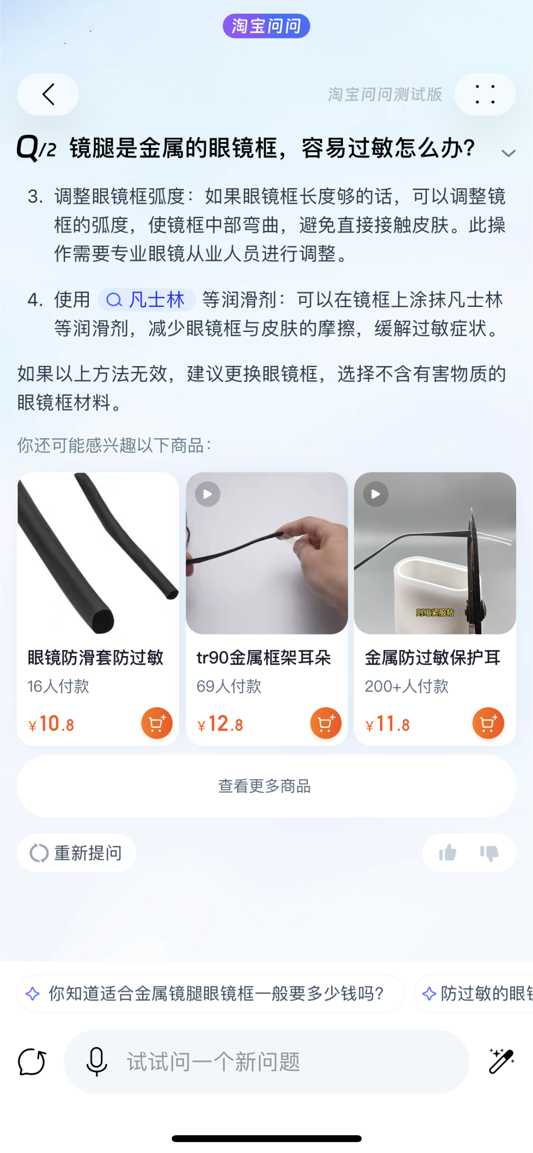 当皮肤对涂层破损的金属眼镜腿过敏时,淘宝问问能够为用户推荐「热缩管」商品链接来解决这个问题。用户也可以询问现在去东北旅游应该准备什么装备,淘宝问问会推荐保暖帽子和手套。用户还可以在淘宝问问上得到一份在飞猪数据支持下生成的东北三日游攻略。