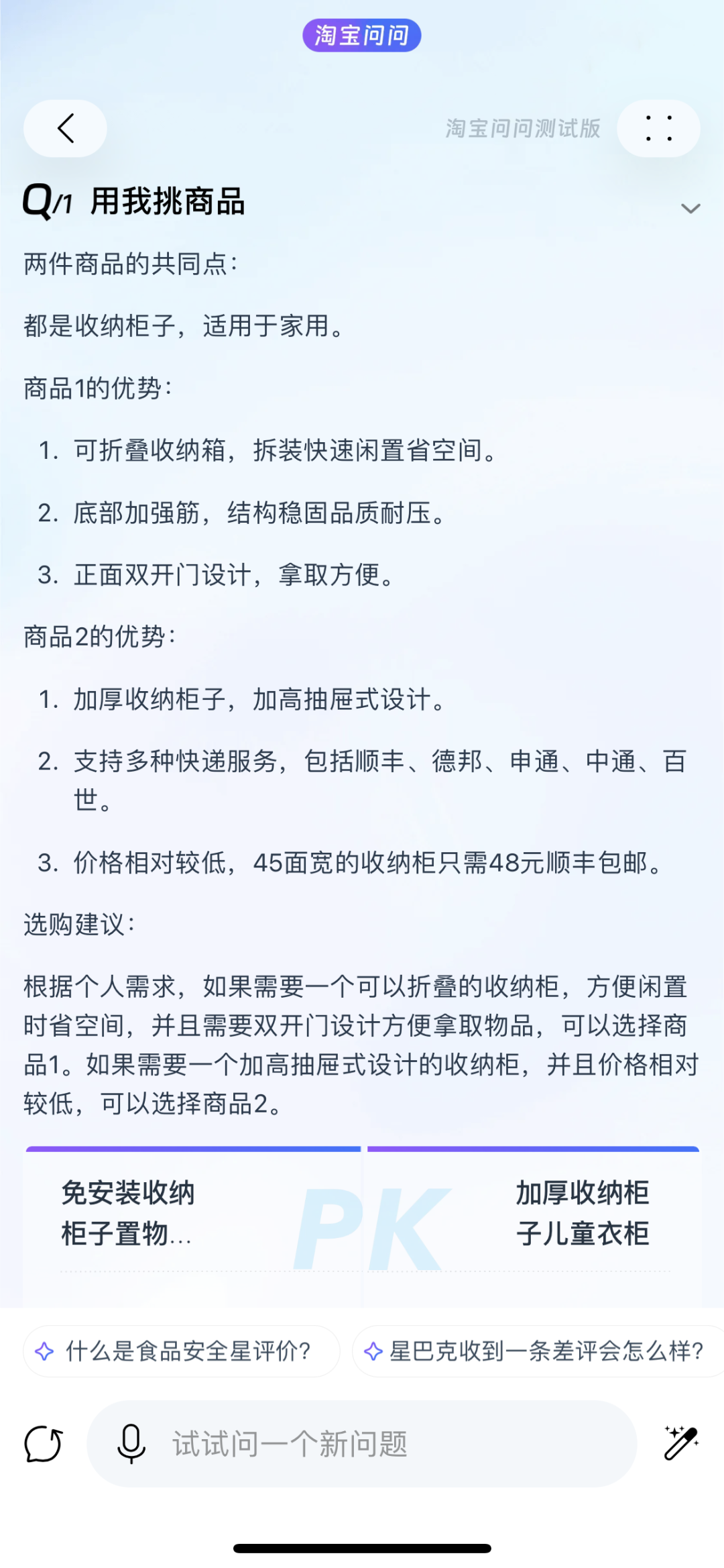 中间层则是一些技能卡,包括「用我挑商品」、「婚礼策划师」、「旅行策划人」、「生活小能手」、「文案达人」等聚焦更细分场景的插件。在「用我挑商品」中,用户可以选择购物车里的同类商品进行比较,淘宝问问能够综合商品介绍、用户评价、下单人数等信息进行比较,给出一个理由更充分的购买建议。
