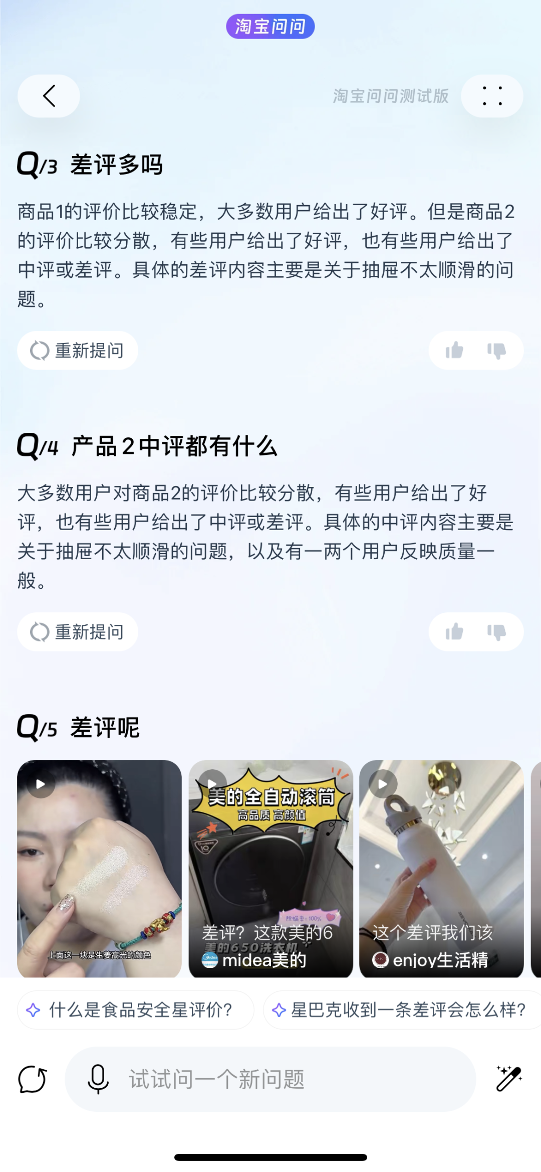 最下面则是对话框,通过一问一答、多轮对话的形式,来解答用户的消费需求。这是淘宝问问的核心,不同于上面两个部分有很强的引导属性,对话框会更考验用户与AI的交流技巧和AI的理解能力。在回答每一个问题时,淘宝问问在界面底部都会为用户提供更多问题推荐,帮助其更顺畅完成对话。