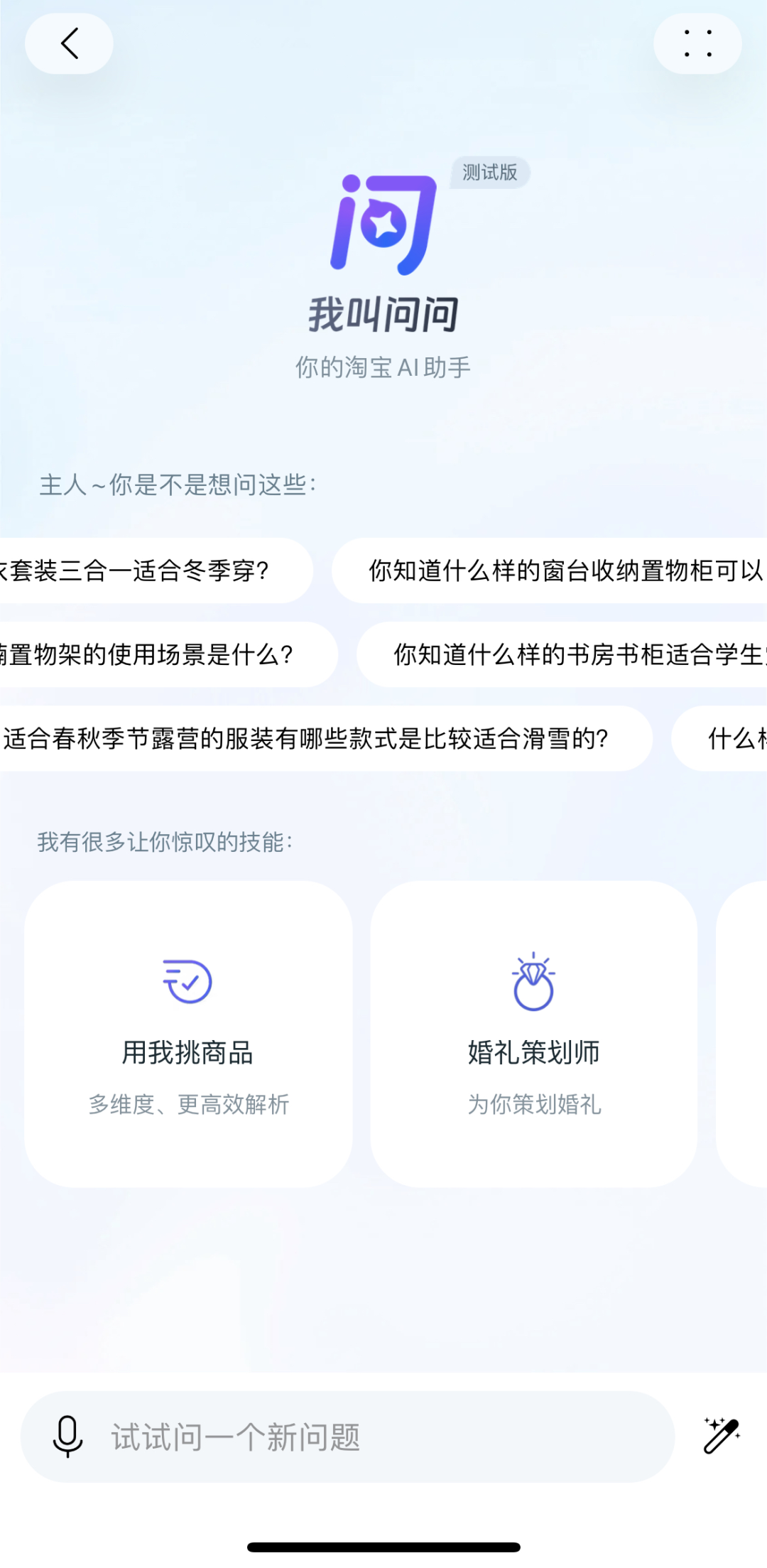 近似于搜索引擎在生成式AI爆发之前就已经推出的搜索提示和搜索预测功能,淘宝问问的这些问题更多起到了引导作用,让没有接触过ChatGPT的用户能够快速了解到自己在淘宝问问上能够做什么。也因此,淘宝问问在首屏给到了提示问题三分之一的展示空间,使其能够以弹幕的形态吸引刚刚进入到淘宝问问的用户。