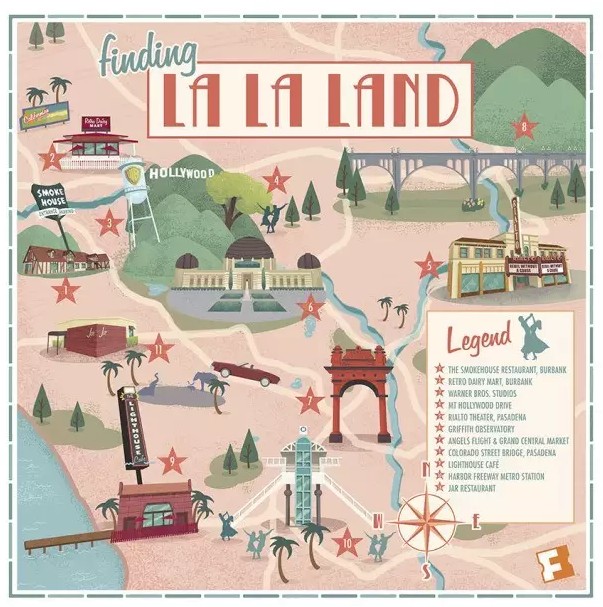 La La Land 一语双关,即指 L.A. 洛杉矶(电影人的追梦处、影片发生的地点),又指一种仿若漂浮在空中、开心到不现实的状态——像爱情,也像是追梦时的心态。