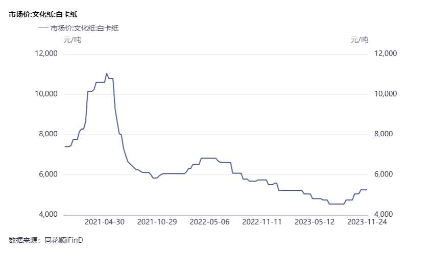 从同花顺数据也可以看到,文化纸中的白卡纸市场价虽自2023年下半年来有所修复,但仍处于历史较低位。