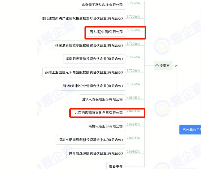 据工商信息平台爱企查,在苏州黑蚁的投资者中,出现了一个熟悉的身影——老铺黄金的竞争对手周大福。具体看,周大福持有苏州黑蚁5.73%的股份,为其第四大股东。此外,泡泡玛特也是其股东,持股2.865%。可以说,周大福、泡泡玛特均为老铺黄金的间接投资者。