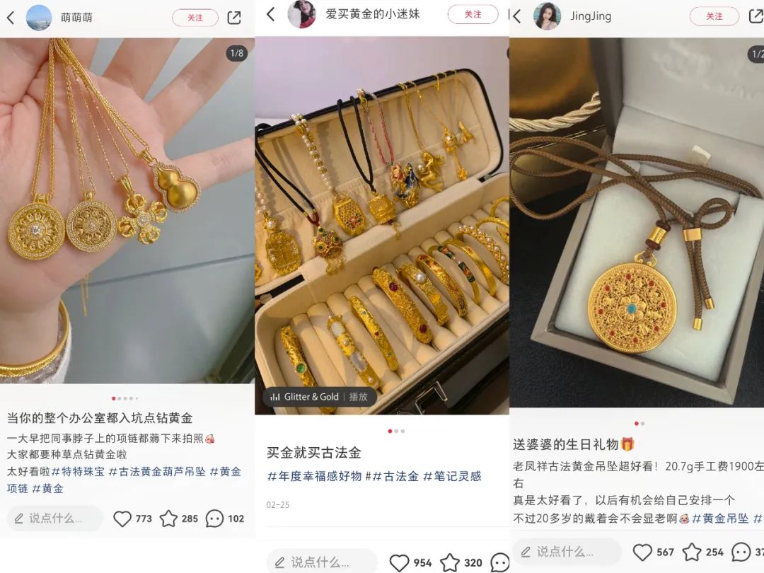 不过,与前几年不同,消费者们除了关注金饰的金价、克重外,颜值也成为一项重要的参考因素。近几年,采用国家古老铸金工艺打造的“古法黄金”,因自带哑光、厚重的古典气息,深得年轻人喜爱。在小红书上,ID名为“诗与远方阿”的博主表示,“不是年少不知黄金香,是年少没有古法金。”
