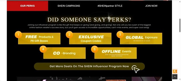 对于体量较小的网红和用户,SHEIN采取Affiliate Marketing(联盟营销)模式,即加入联盟后,推荐成功将能获得订单金额10%-20%的佣金,可观的返佣比例让更多用户愿意加入宣传。