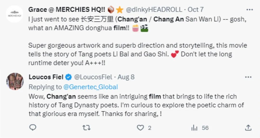 部分网友表示这部动画电影无论是制作还是立意都为之震撼,从盛唐时期的繁荣,到安史之乱后的萧瑟,都通过中国特有的诗歌载体来谱写。而且不只是中国人会去看这部电影,许多本地的外国观众也表达了对这部电影的赞赏。