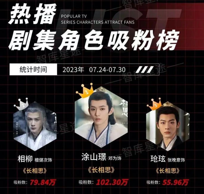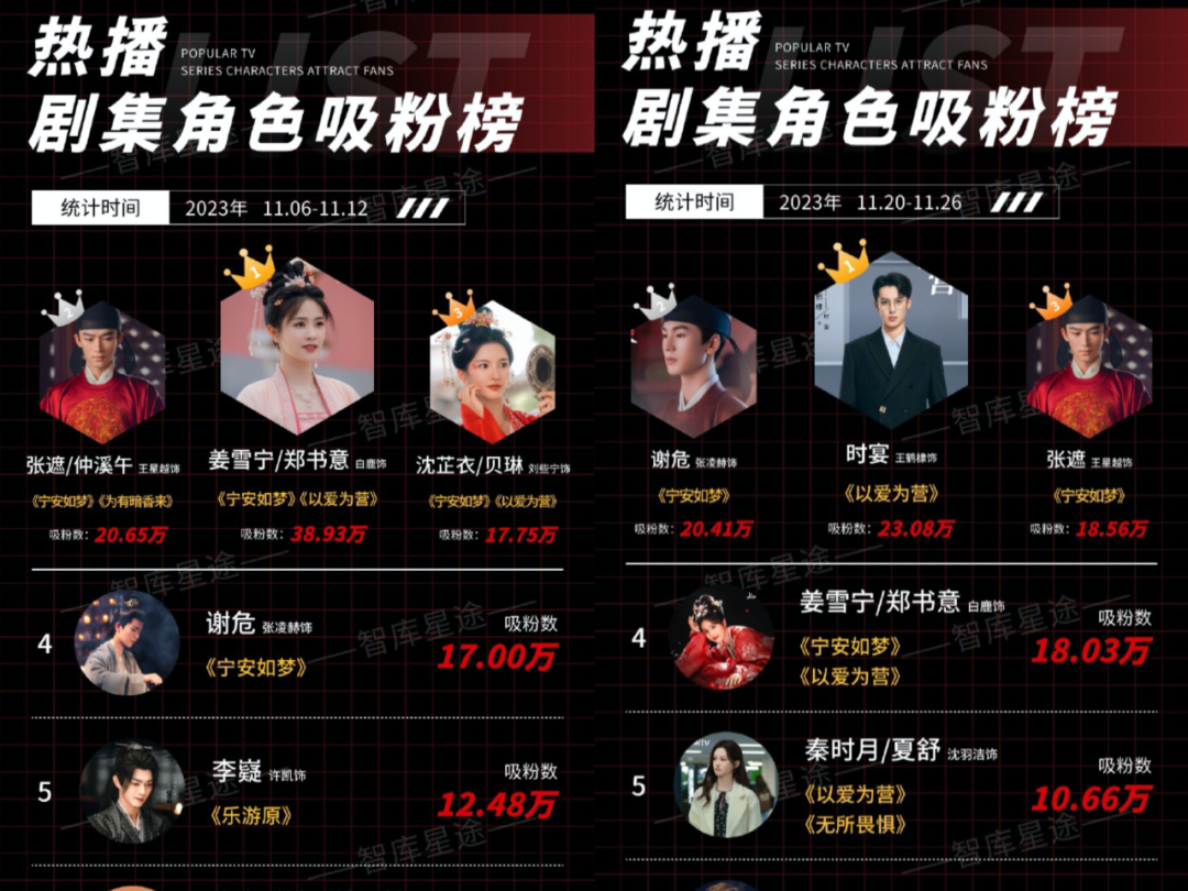今年的古偶剧中,《宁安如梦》中的谢危、《长相思》中的玱玹(张晚意 饰)均属于女性向剧集中的“大男主”,更需要演员有一定角色驾驭能力。据智库星途统计的角色吸粉榜来看,开播前期王星越饰演的张遮与女主有更多感情纠葛,“白月光”发力导致王星越的吸粉力度超过了专注于朝堂争斗的男主张凌赫,而临近结局的一周,男主向女主强势告白,两人情感急速升温、撒糖,张凌赫吸粉力度反超王星越。