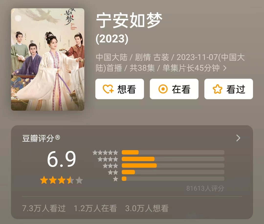 好在原作和编剧加分,使得糙点不少的《宁安如梦》豆瓣评分达到6.9的及格线以上。这背后不仅仅是古偶剧质量的问题,也反映了资本和平台对于“待爆帝”们的拔苗助长,与古偶剧受众对于剧集质感的要求不断上升的矛盾。