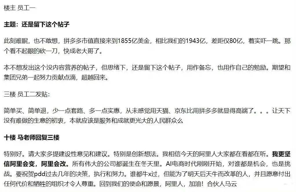 据说阿里员工们的回帖还是比较有凝聚力的,既然老板都带头称赞竞争对手了,对于拼多多这些年的崛起,在一线拼杀的淘天员工恐怕更知冷暖。
