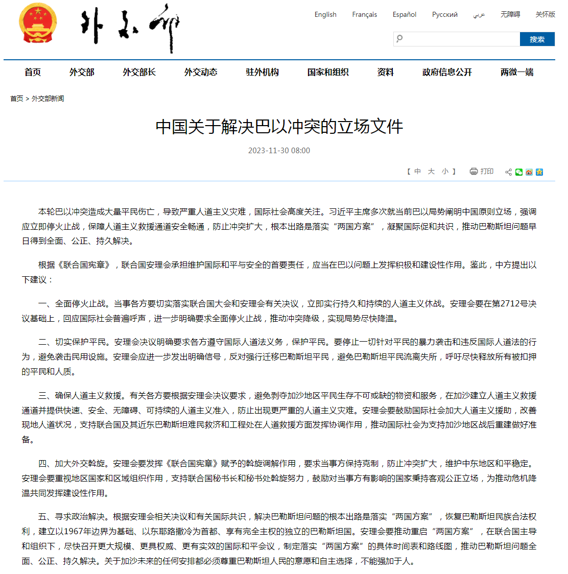 11月30日,外交部网站发布中国关于解决巴以冲突的立场文件:
