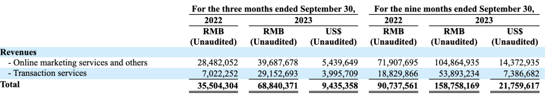 拼多多的电商广告收入及交易服务收入,图源 / 拼多多2023年第三季度财报