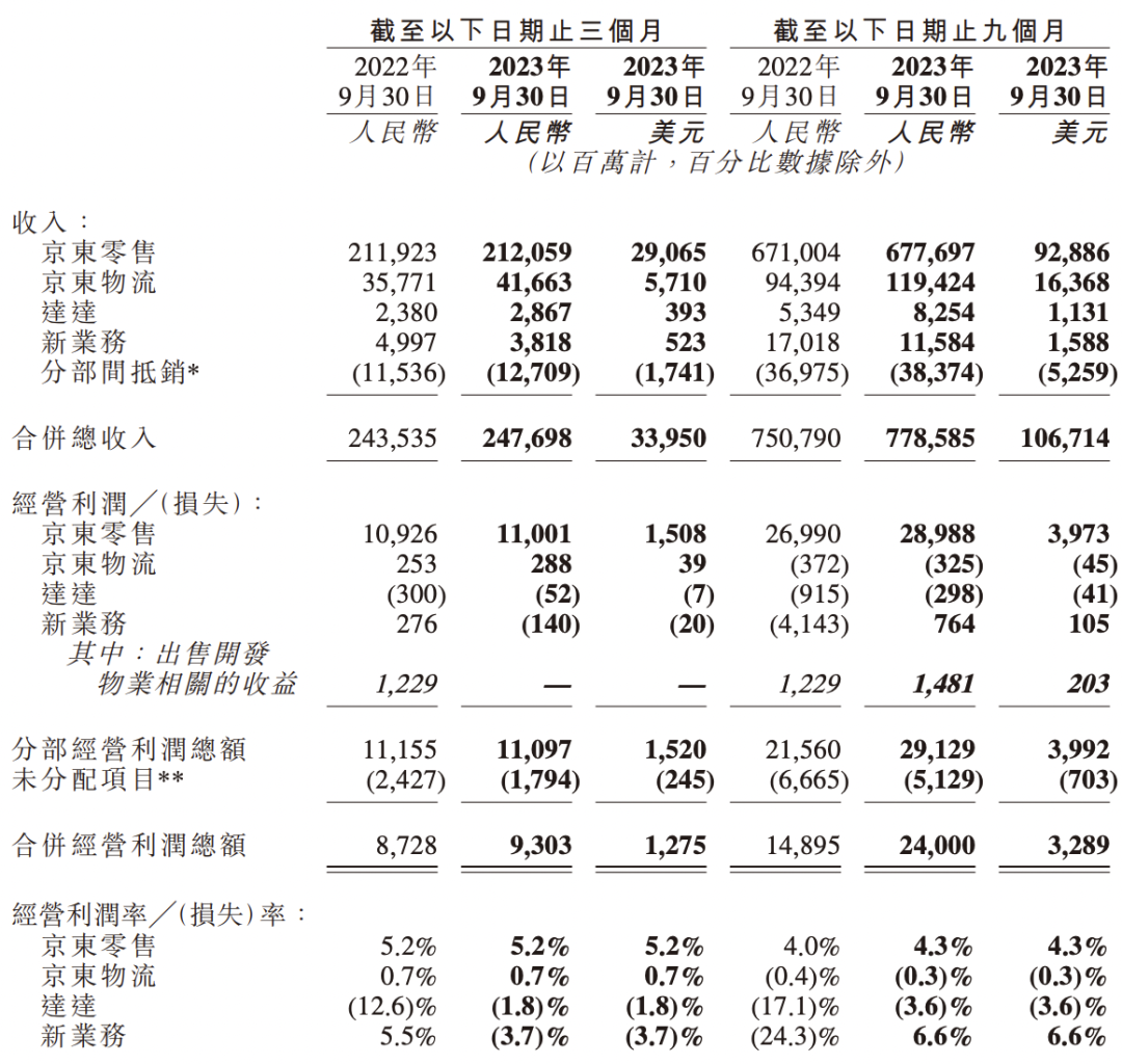 京东各部收入和利润情况,图源 / 京东2023年第三季度财报