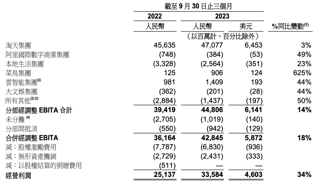 阿里各部经调整EBITA利润,图源 / 阿里2024财年第二财季财报