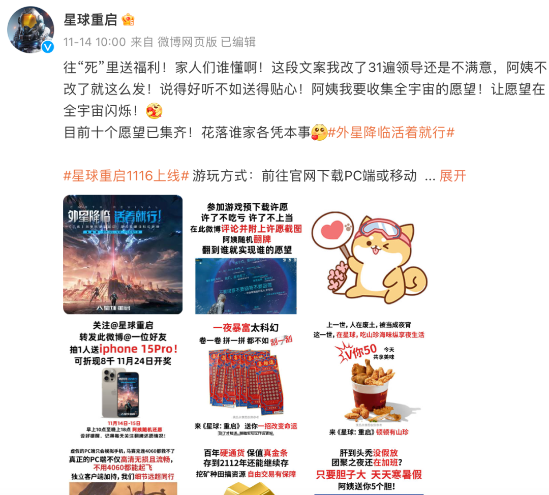 在星球重启官微里,情况也较为类似——偶尔发“疯”抽奖送福利,还是很引流的。但其它时候又会回归正常品宣的调调——“人格分裂”也人传人?