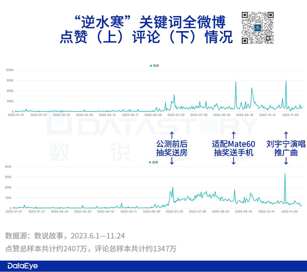 DataEye研究院统计了6月以来,关键词“逆水寒”全微博的点赞数、评论数趋势(全微博点赞评论波动,主要得益于官微动作)。