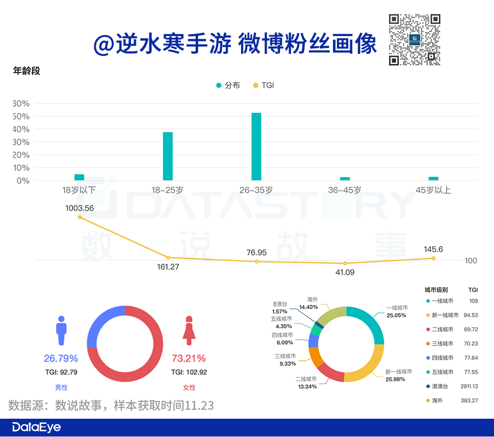 根据数说数据,微博号“@逆水寒手游”的关注粉丝,以年轻女用户居多:年龄方面26-35岁占比52.54%,18-25岁占比37.51%。性别方面,女性占比73.21%。他们主要分布在一线或新一线城市,合计占比51%。(由于一些粉丝未填或随便填的基础资料,因此数据只作参考)。