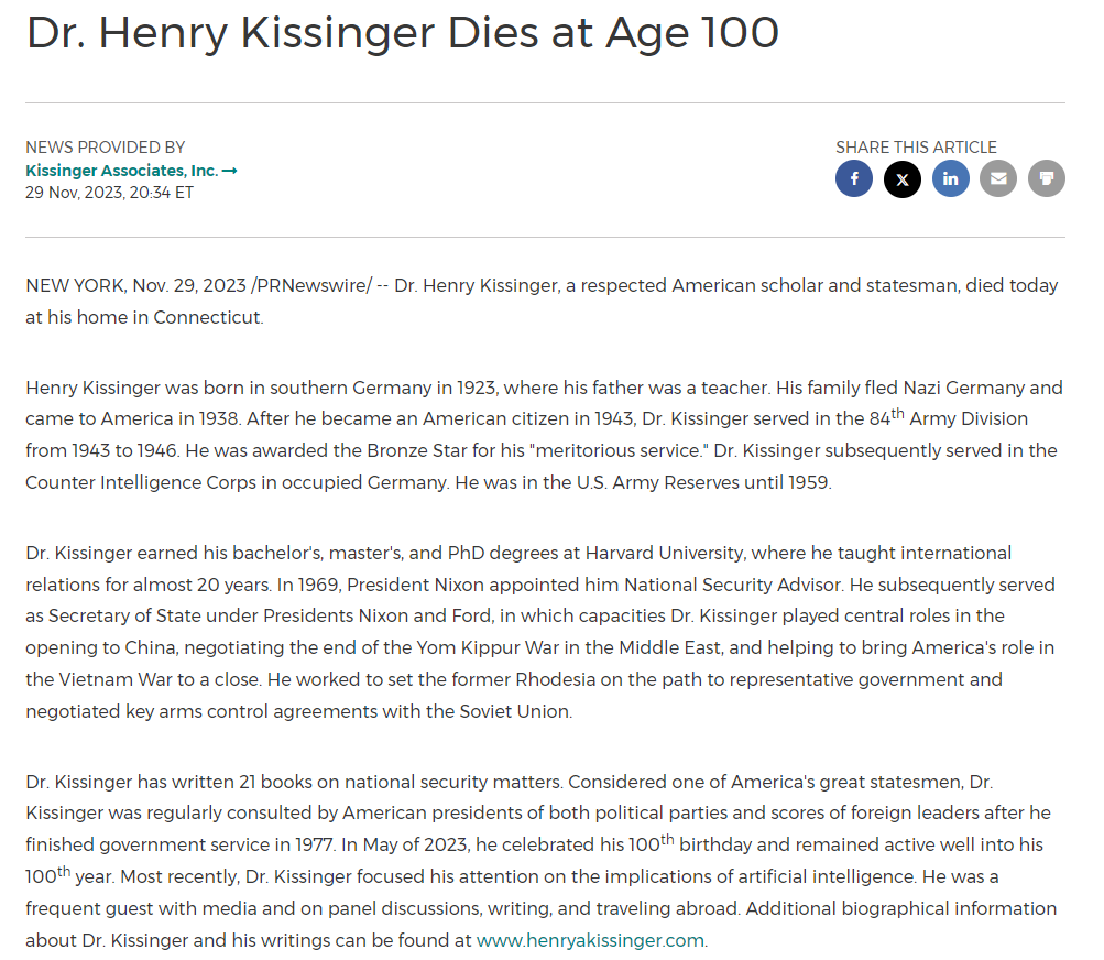 基辛格咨询公司于纽约时间11月29日晚发布声明称,美国前国务卿亨利·基辛格当天在康涅狄格州的家中去世,享年100岁。