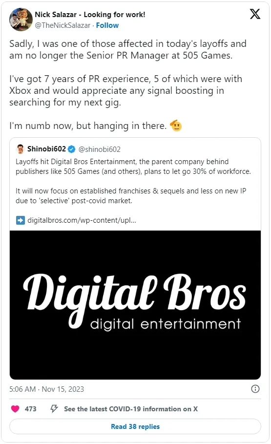 除此之外,最新的裁员消息还包括Bungie有近100人遭到了裁员,在公司中的占比约为 8%;曾发行了《收获日 2》、《黎明杀机》、《幽灵行者 2》和 Remedy 的《控制》等诸多游戏的知名游戏发行商 505 Games 母公司 Digital Bros 近日发布新闻稿,表示最多会裁员 30%;亚马逊游戏也表示将会裁员180人;Embracer Group准备于 12 月 11 日关闭《时空分裂》研发工作室 Free Radical Design;《英灵神殿》Xbox移植开发商Fishlabs宣布裁员50人;Unity将裁减265 个工作岗位,占全球员工总数的 3.8%……