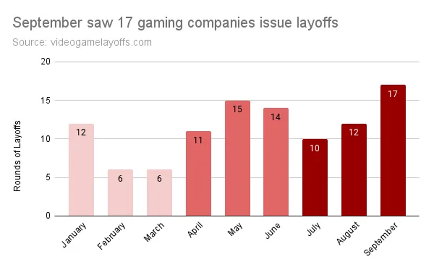 一些经营不佳的游戏公司则面临着成本上涨、参与度不高和销售额下滑的困境。在多年的过度扩张和投资后,一些公司还不得不仔细审视自己的项目、当前的市场风向和成本。这些都或多或少地导致了过去多个公司曝出裁员的消息。