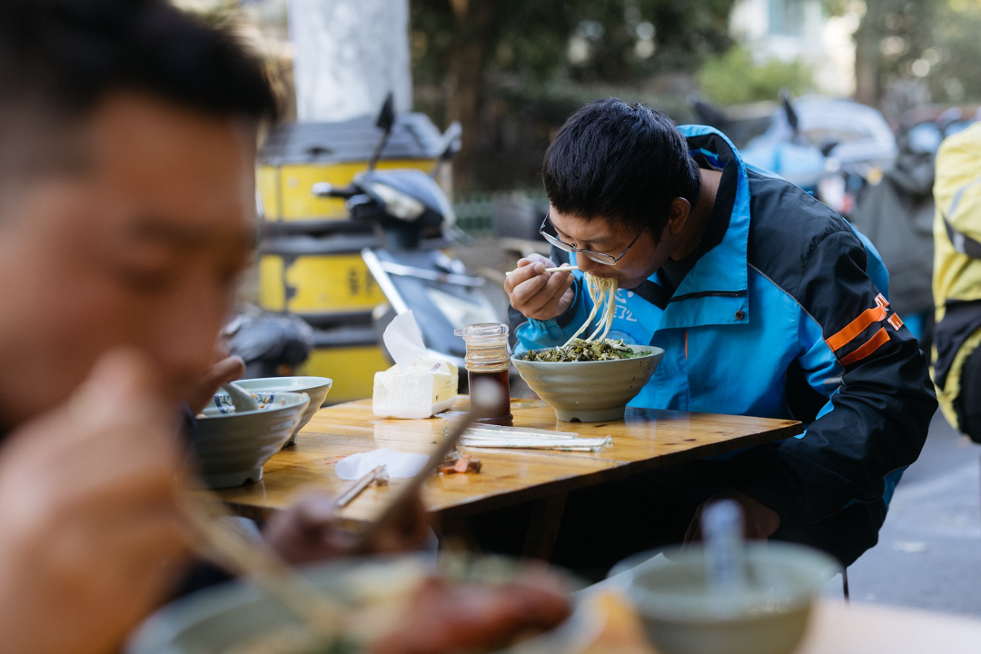图 | 下午2点半,午高峰结束后郭仁俊来到小巷里的一家面馆吃午餐,今天他点了一份12元的雪菜肉丝面