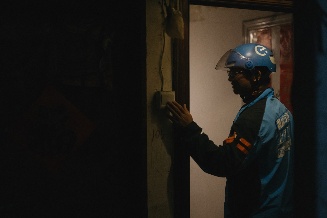 他立刻把印有“饿了么”字样的工作服脱去,塞进后备箱,连电梯都没等,直接爬楼梯送到了夫妻俩手里。“电梯里永远都是人,每一层都停,我们没办法跟着等,送单要紧”。