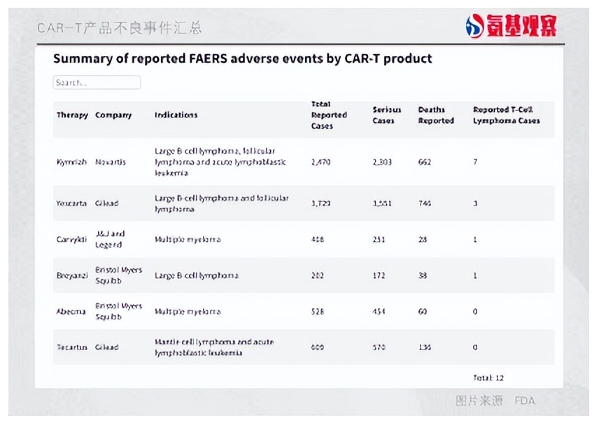 当天,FDA宣布,正在调查已上市的CAR-T疗法是否会在极少数情况下导致T细胞恶性肿瘤。根据FDA不良事件报告系统(FAERS)数据,目前共有12例相关案例。