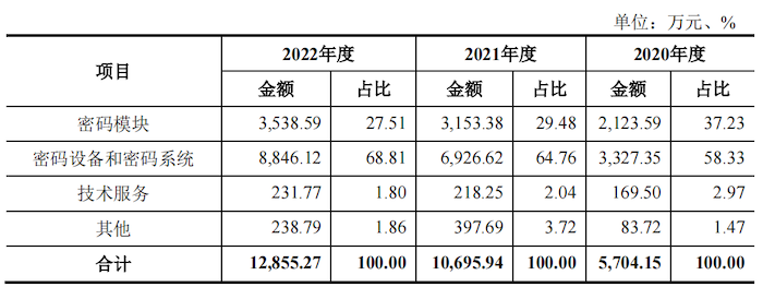 界面新闻记者注意到,2020年至2022年渔翁信息的产品销售以向集成商销售为主,占比分别为95.35%、99.07%、91.24%。其中,公司向项目集成商销售的产品以密码设备和密码系统为主,向零部件集成商销售的产品以密码模块为主。