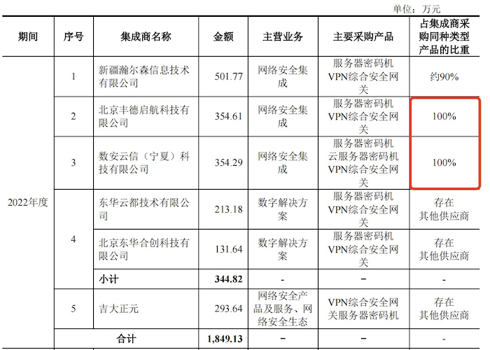 值得注意的是,渔翁信息前五大集成商客户之一——北京丰徳启航科技有限公司,2022年向公司采购的云服务密码机、VPN综合安全网关产品占其当年采购同种类型产品的比例为100%。此外,数安云信(宁夏)科技有限公司2022年采购渔翁信息服务器密码机、云服务器密码机、VPN综合安全网关产品占数安云信当年采购同种类型产品的比例也高达100%。