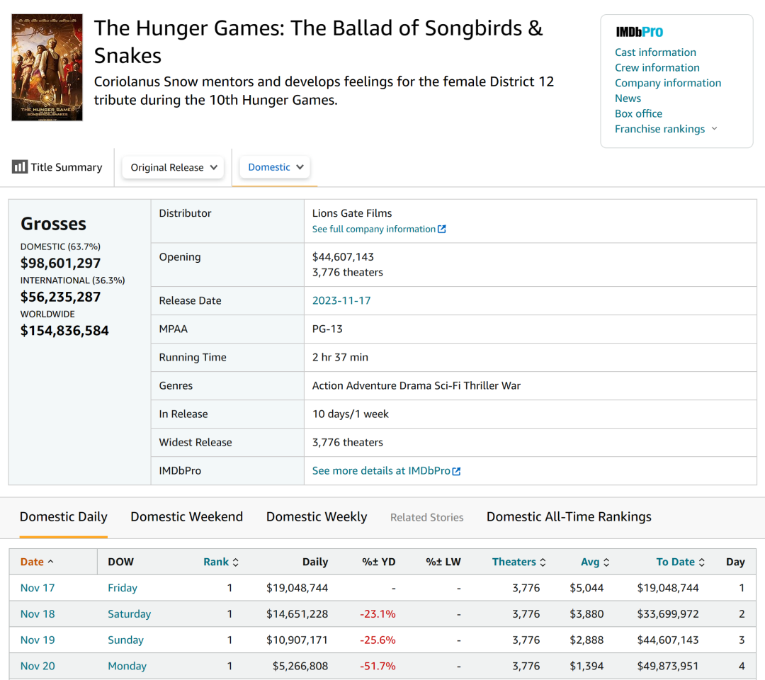 据The-Numbers统计,《饥饿游戏5》在零点场进账575万美元,与前一周的《惊奇队长2》相仿(660万美元)。从上上周五开始,《饥饿游戏5》铺开至北美3776家影院,首日以1905万美元登顶榜首,随后两天分别下滑23%和26%,首周末报收于4461万美元,单馆收益为1.18万美元,与《惊奇队长2》(4611万美元)难分伯仲。