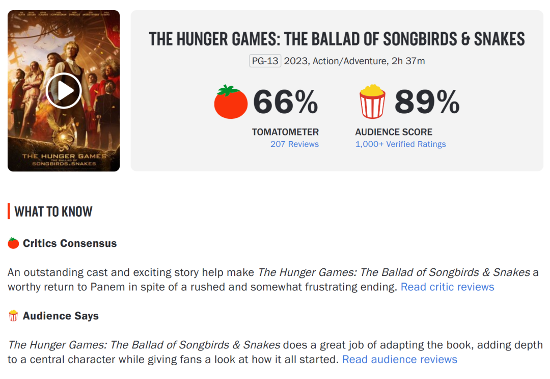 从口碑来看,《饥饿游戏5》的烂番茄新鲜度为66%,与备受争议的《惊奇队长2》(61%)不相上下,但《饥饿游戏》前四部都在70%以上;影评人表示其“出色的演员阵容和激动人心的故事”值得让观众重返“施惠国”,但“结局仓促且有些令人沮丧”;同时《饥饿游戏5》的爆米花指数高达89%,反倒不低于所有正传的作品,足见系列粉丝对这部新片的肯定。《饥饿游戏5》在IMDb上则得到7.2分(3.4万个评价),在整个系列中位居中游。来到周一,《饥饿游戏5》环比下跌52%至逾526万美元,依旧稳守票房榜头名。