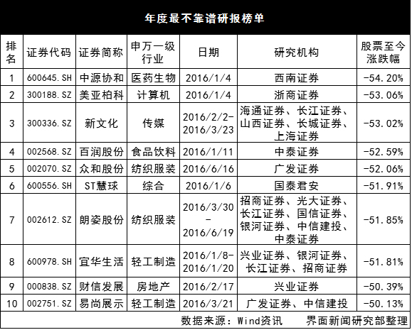 随着2016年最后一个交易日的收市,各家券商研报推荐效果如何呢?界面新闻对2016年73家券商的46179份涵盖买入及增持等评级的正向报告进行整理,以收盘价计算每份研报推荐的股票自推荐日起至2016年最后一个交易日的区间收益。若推荐日时股票处于新股上市连续涨停阶段,则以开板日为买入起始点计算收益。最后,排名(存在并列的情况)如下: