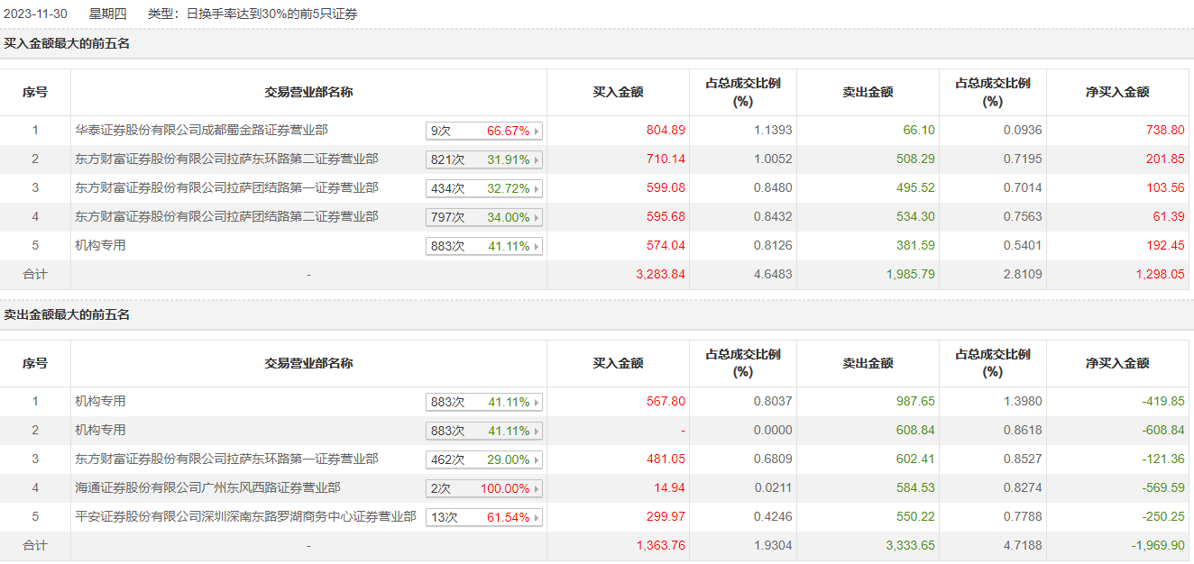 粤万年青11月30日上涨9.10%,全天换手率36.50%,成交额7.06亿元,振幅18.98%。龙虎榜数据显示,机构净卖出836.24万元,营业部席位合计净买入164.39万元。深交所公开信息显示,当日该股因日换手率达36.50%上榜,机构专用席位净卖出836.24万元。上榜的前五大买卖营业部合计成交9967.05万元,其中,买入成交额为4647.60万元,卖出成交额为5319.45万元,合计净卖出671.85万元。