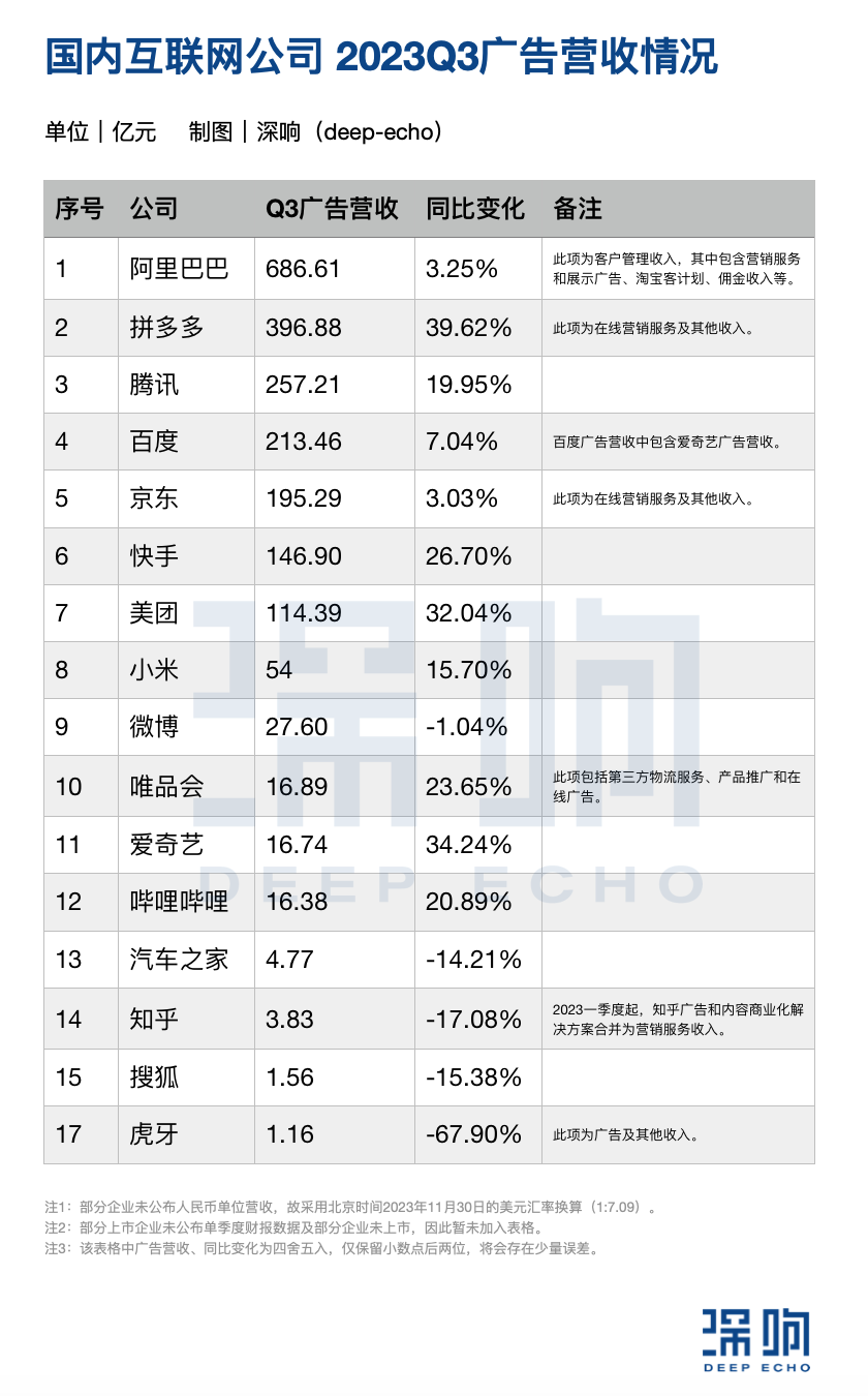 阿里巴巴的客户管理(广告与佣金)收入同比增速在今年二季度才由负转正,得益于年中大促,增速达到10%。三季度,其客户管理收入为686.61亿元,这一收入体量仍然远超其他大厂;同比增长3%,增速相比二季度略有回落,财报中阿里也明确解释,商家对于广告投资的意愿有增强,更多是因为GMV轻微下降所抵消。