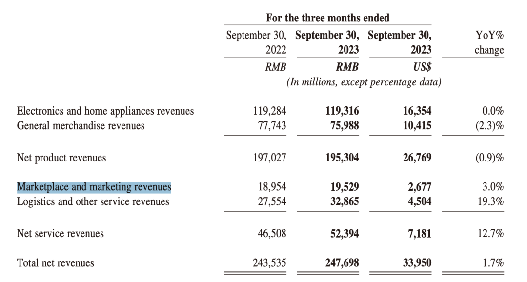 尽管,京东在财报和电话会上都特别强调了三季度3P(第三方商家)数量加速扩张,达到历史新高水平,3P的广告收入增速也达到了两位数。但很明显,将其对比整体的市场与营销收入来看,3P商家的营销投入在整体营销收入中占比较小,对整体增速并没有发挥太大的带动作用。