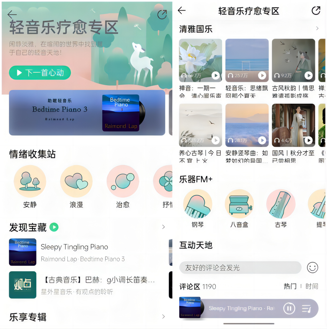 QQ音乐设置有【轻音乐疗愈专区】,其中设置了“情绪收集站”,根据不同情绪进行曲目推荐;同时也根据乐器分类设置了“乐器FM+”。