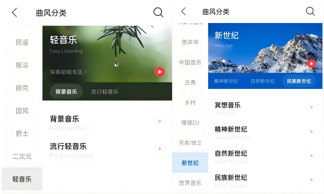 网易云音乐则更为简单,设有【助眠专区】,进行歌单和单曲推荐,冥想音乐则被划分在【新世纪】。