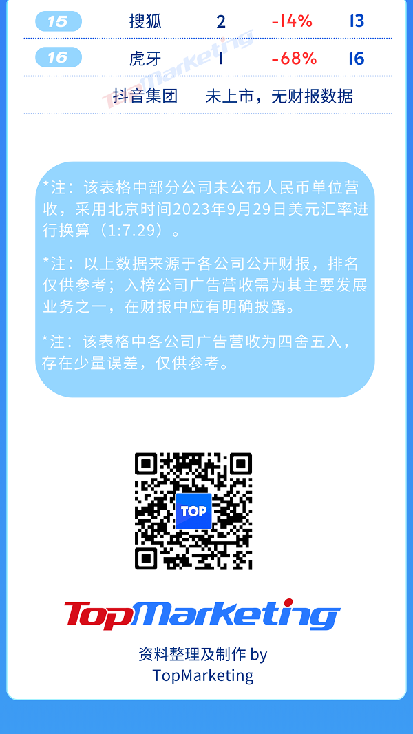 TOP君根据公开财报整理了16家主流互联网公司的广告营收数据,一览国内广告市场的收入与变化情况。