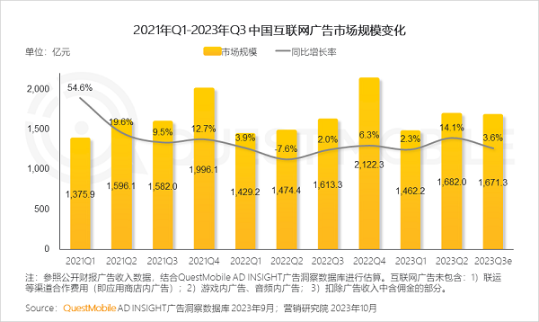 16家主流互联网平台上半年平均广告收入同比增长7%,整体依旧延续复苏态势,而这也与QuestMobile的统计数据保持一致。据QuestMobile数据显示,在整体市场复苏回暖的趋势下,互联网广告市场2023Q3同比增长3.6%。