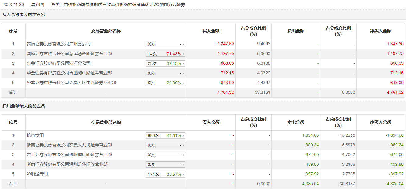 长华集团11月30日涨停,全天换手率达2.3%,振幅达10.2%。龙虎榜数据显示,营业部席位合计净买入376.28万元。其中,机构合计净卖出1894.08万元。此外,安信证券广州分公司、国盛证券慈溪慈甬路证券营业部分别买入1347.60万元、1197.75万元;浙商证券慈溪天九街证券营业部、方正证券杭州南山路证券营业部分别卖出959.24万元、674.00万元。