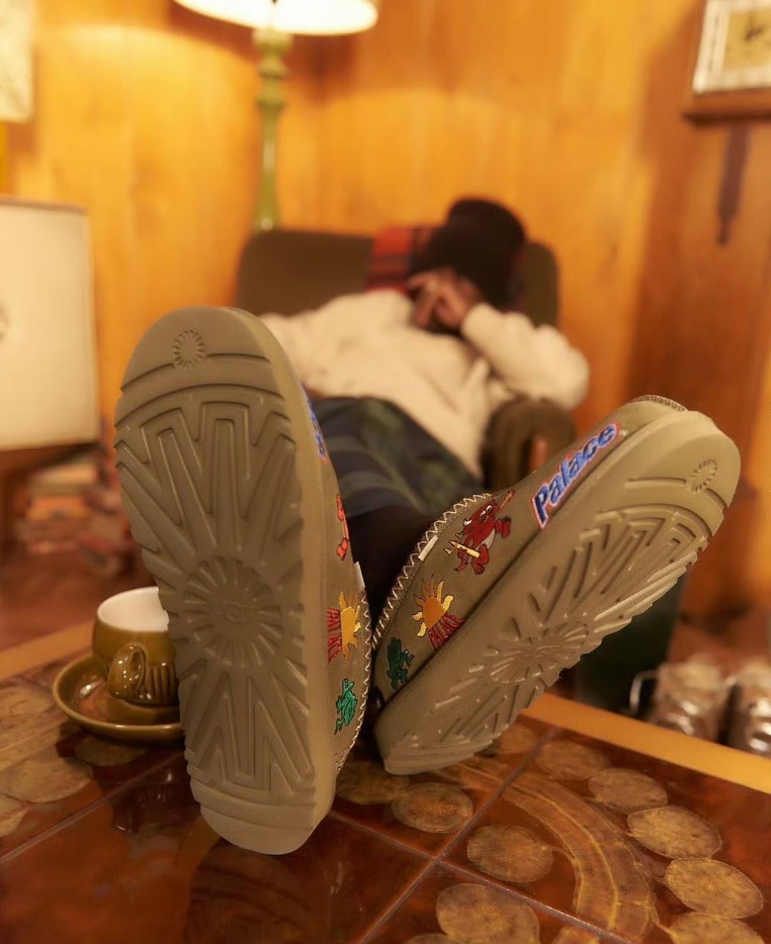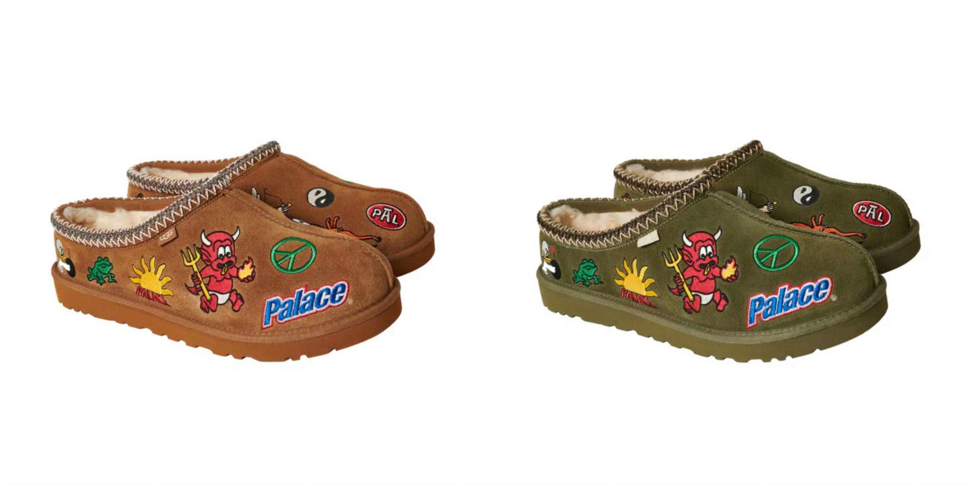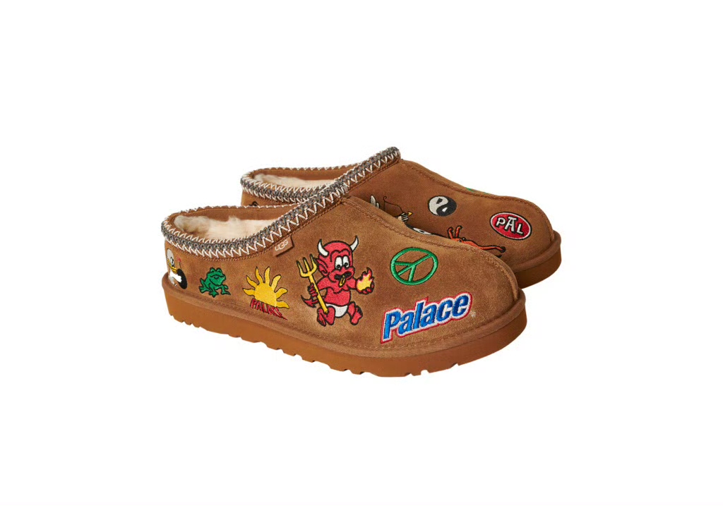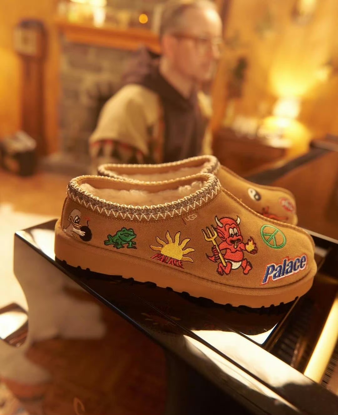 全新联名系列推出以棕色、绿色麂皮制成的Tasman Slipper鞋款,该鞋采用双色调刺绣,打造温暖舒适感。鞋身布满卡通人物与Palace字样,还有Palace的Baby Devils、Psychedelic Sunrises以及Bomb-Holding Ducks等图案缀饰,整体外观十分丰富。鞋底则印有UGG字样,彰显联名身份。