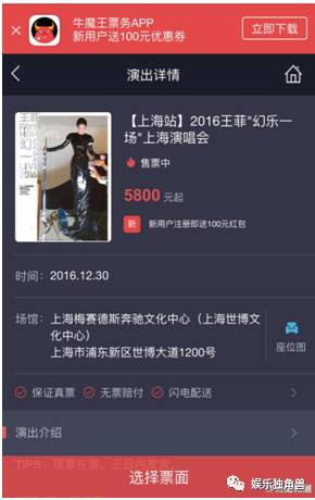 12月5日,王菲演唱会“幻乐一场”开始售票,大麦网发售演唱会门票,门票价格分为1800、5800、7800元(看台/内场)三个档次,且每位用户限购两张。据统计,当晚8:00开售后,门票不到30秒便全部售罄。随后,门票价格一路飙升,7800元的内场票被炒至20000元,黄牛票被炒至几十万一张,VIP票价甚至被叫价100万元拍卖。