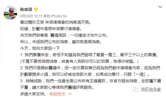 王菲演唱会要在年底举办的消息传出后不久,6月24日,经纪人陈家瑛便在微博怒斥“最贵一万三、最平三千以上的票价”为假消息。9月9日,王菲召开记者会,宣布演出时间为12月30日,演唱会门票最低1800元。