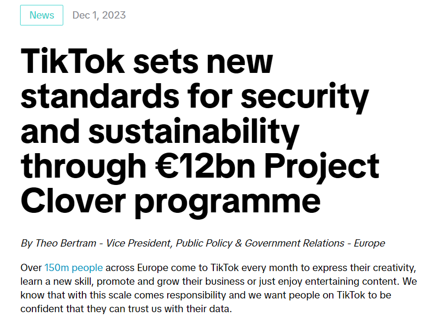 TikTok 12月1日发布声明,宣布未来10年将在欧洲投资超120亿欧元实施“三叶草项目”(Project Clover),旨在为超1.5亿欧洲用户提供数据保护。