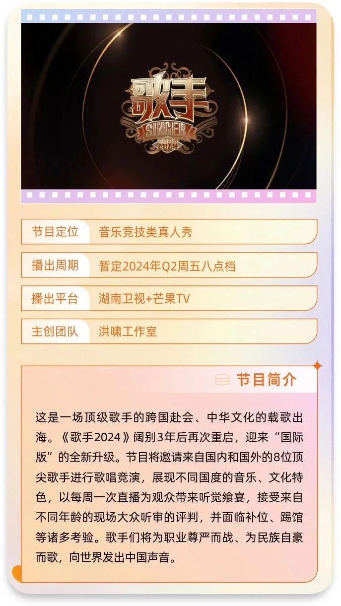 除了《声生不息》,芒果台明年最具市场号召力的大音综项目无疑是《歌手2024》。时隔多年重磅重启,这个曾助力众多华语歌手事业翻红的大IP依旧抗打,而招商会透露的“国际歌手”“一周一直播”等新鲜看点也令市场颇为兴奋。