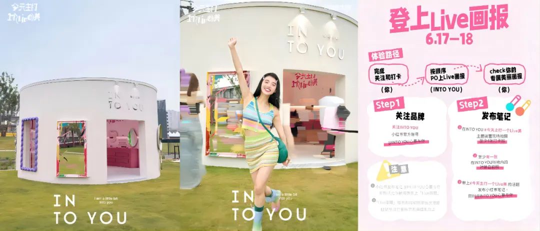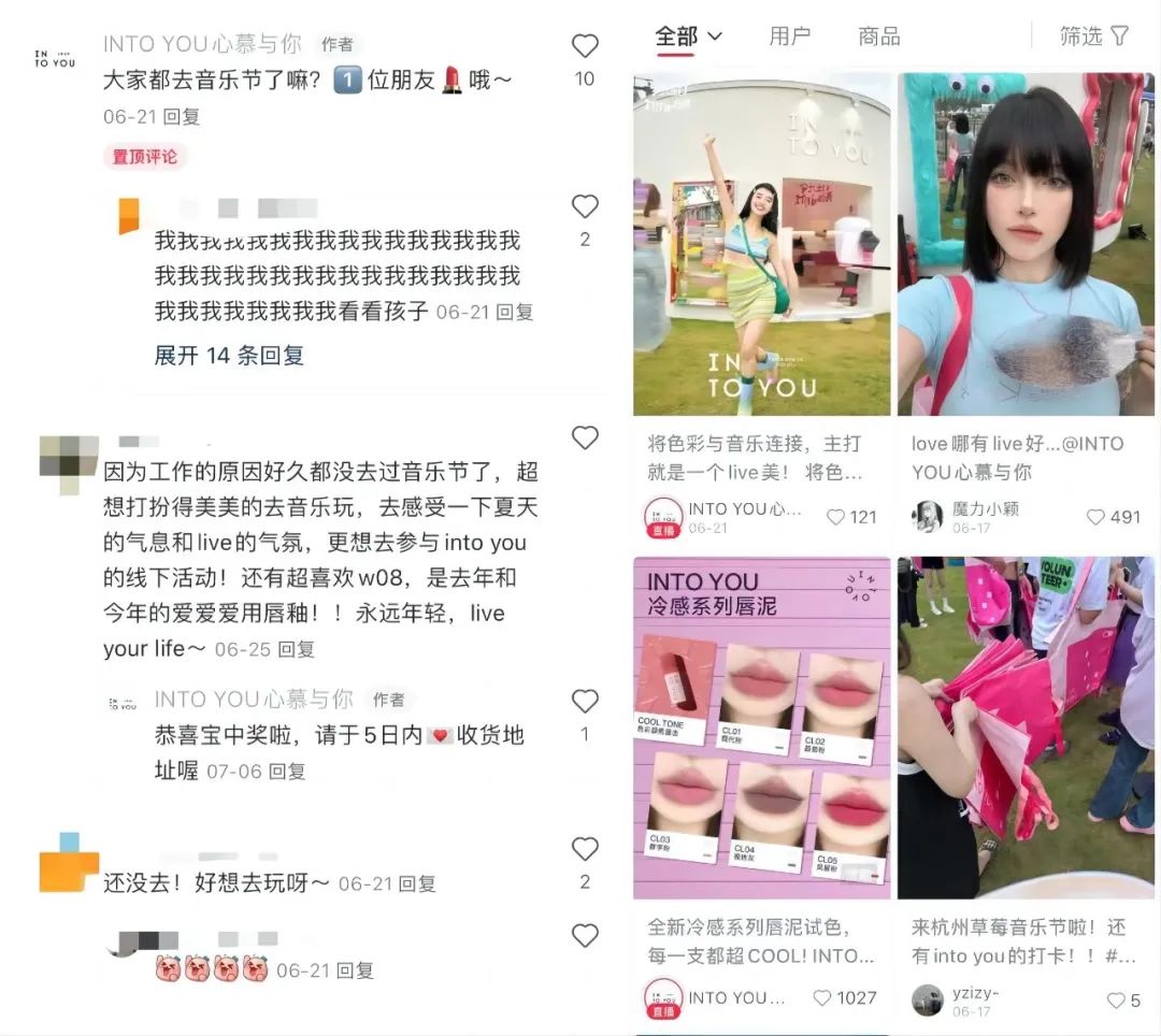 譬如,INTO YOU心慕与你早在2022年就已经与草莓音乐节进行合作。今年的杭州草莓音乐节前后,INTO YOU心慕与你先在小红书等社媒平台进行宣传,主要有4个活动板块,即超出片夸夸镜、专属陈列区、定制Live画报、限定周边,以此吸引年轻人打卡。